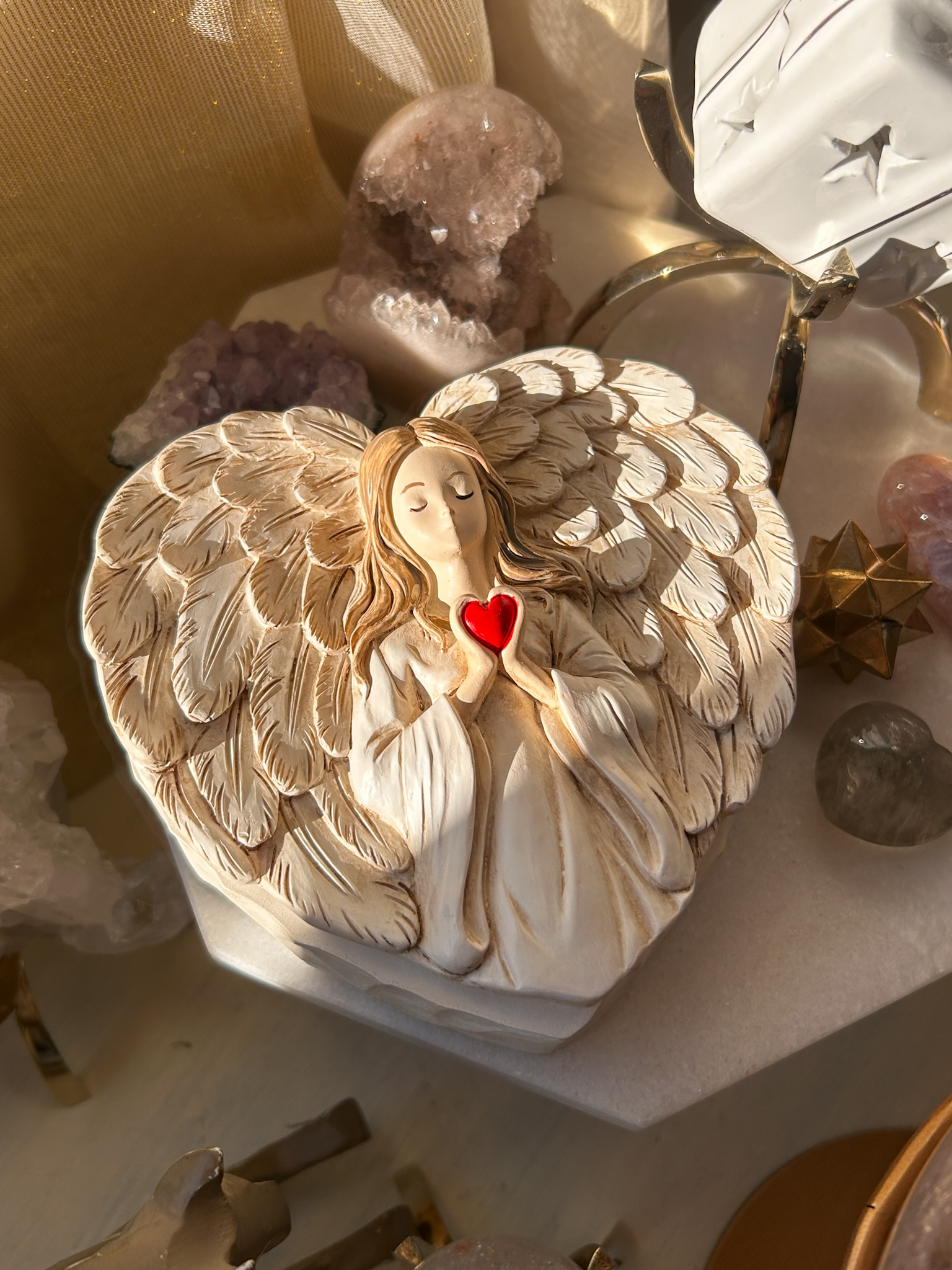 かわいい目を閉じてお祈りをする天使が形どられた小物入れです