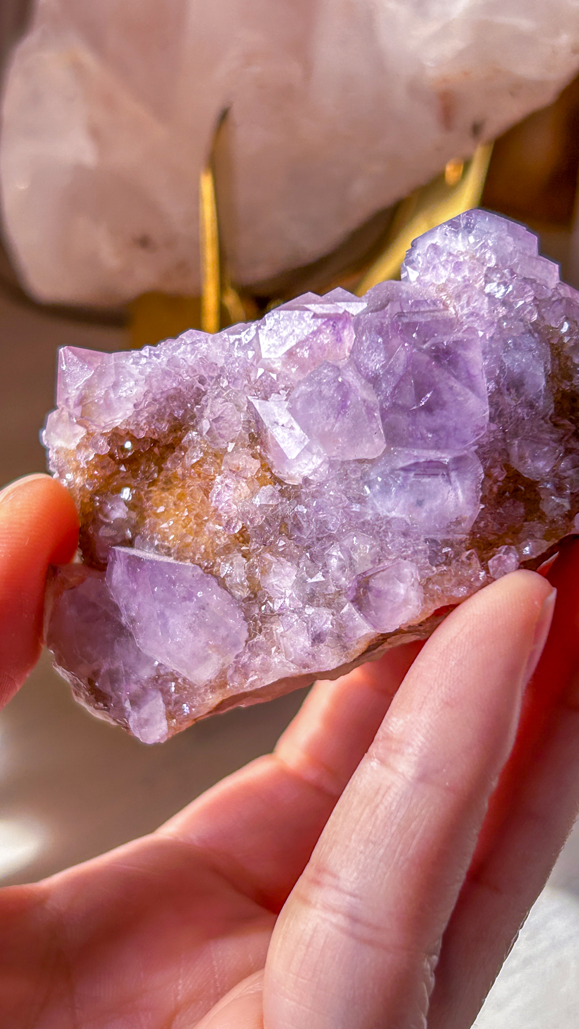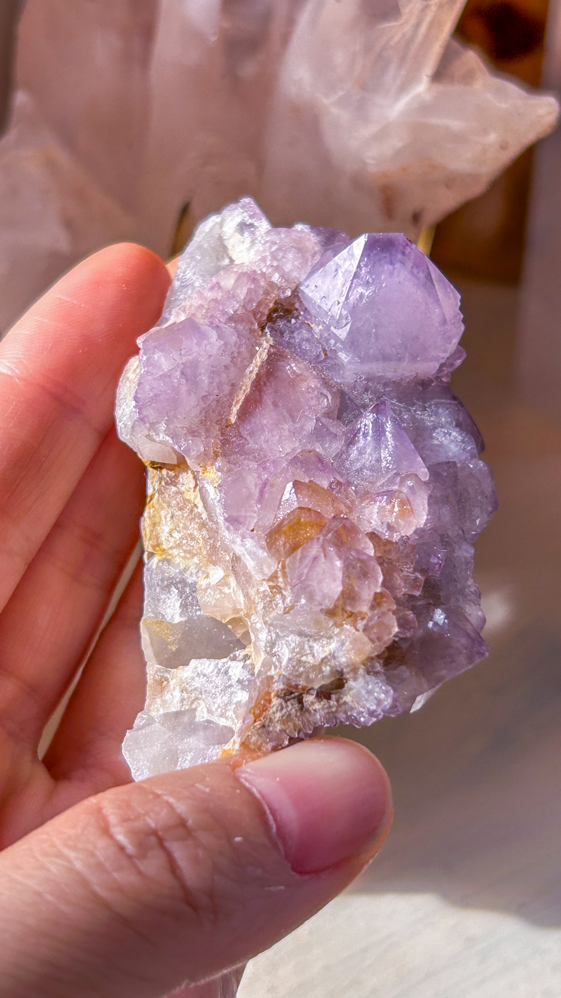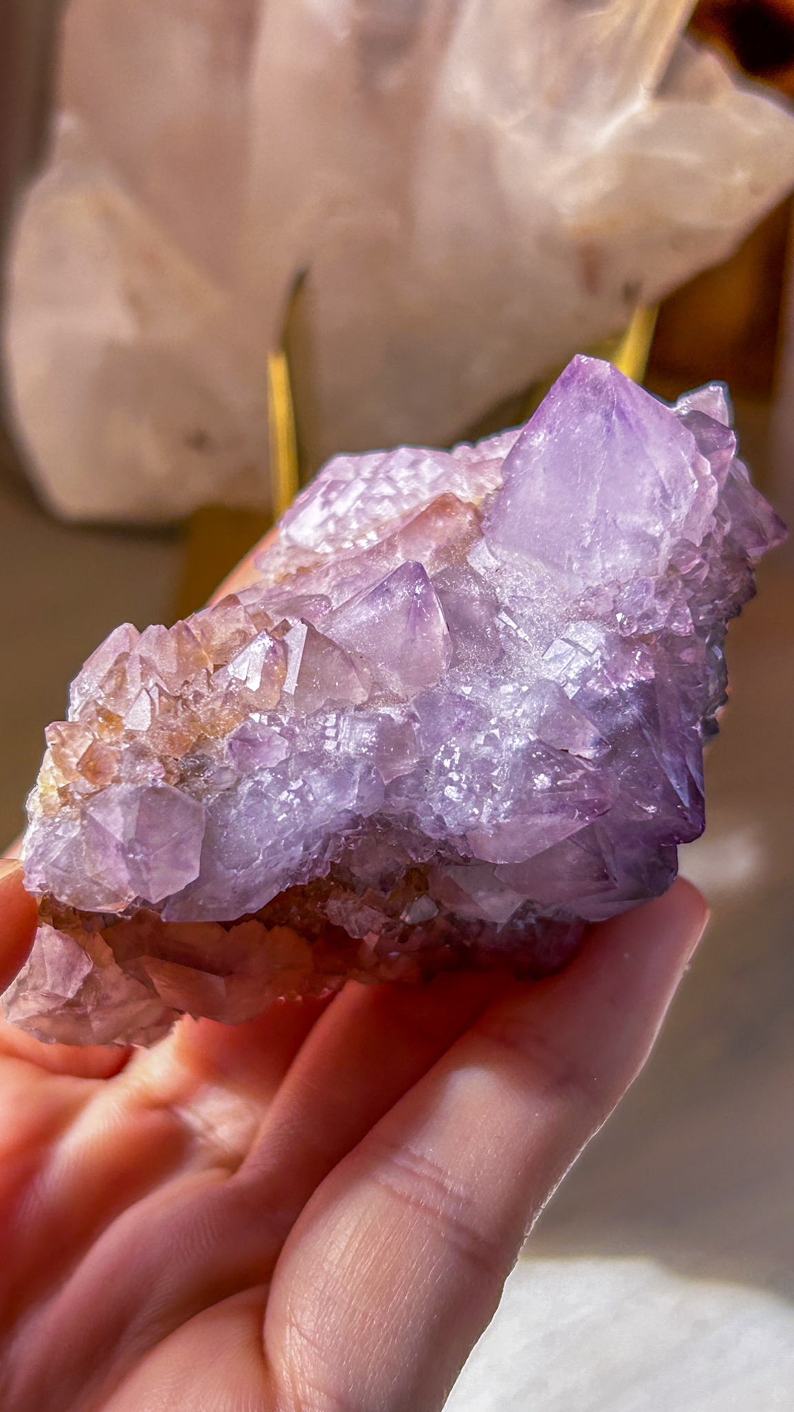 このスピリットアメジストは、珍しい南アフリカ産地より届いたスペシャルなクラスター。写真では濃く写ったのですが、肉眼だともう少し淡い色合いです。