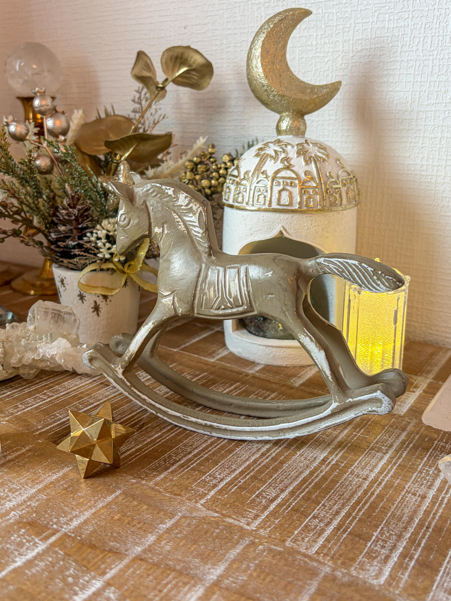 そのずっしりとした質感と、馬の表情や装飾には、西洋の古典的なロッキングホースとは一味違う、