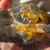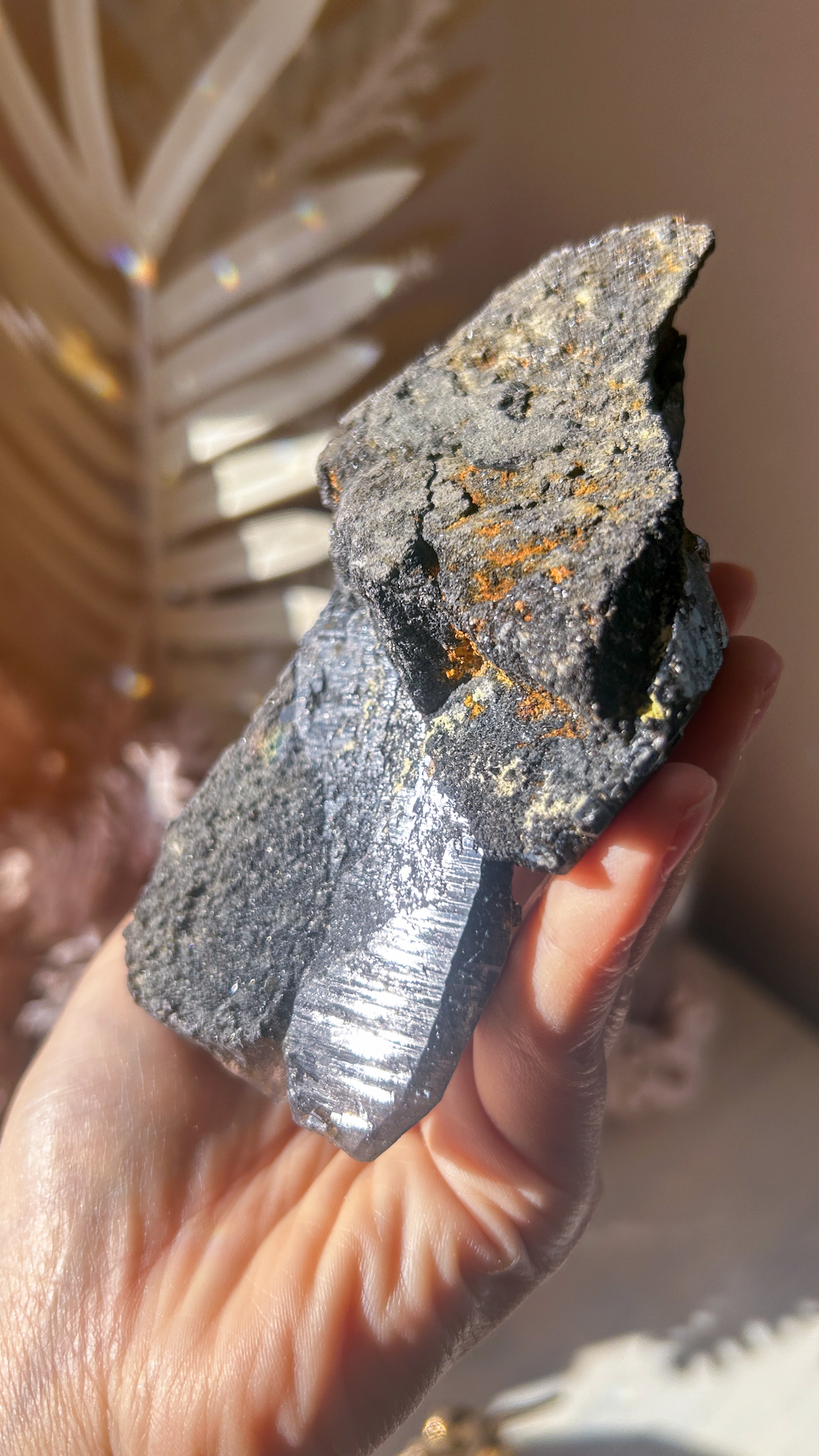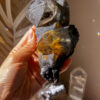 黒いトルマリンに、ギラリと輝くイエローヘマタイト。さらに内部にはトルマリンブラックルチルがびっしりと広がっています。