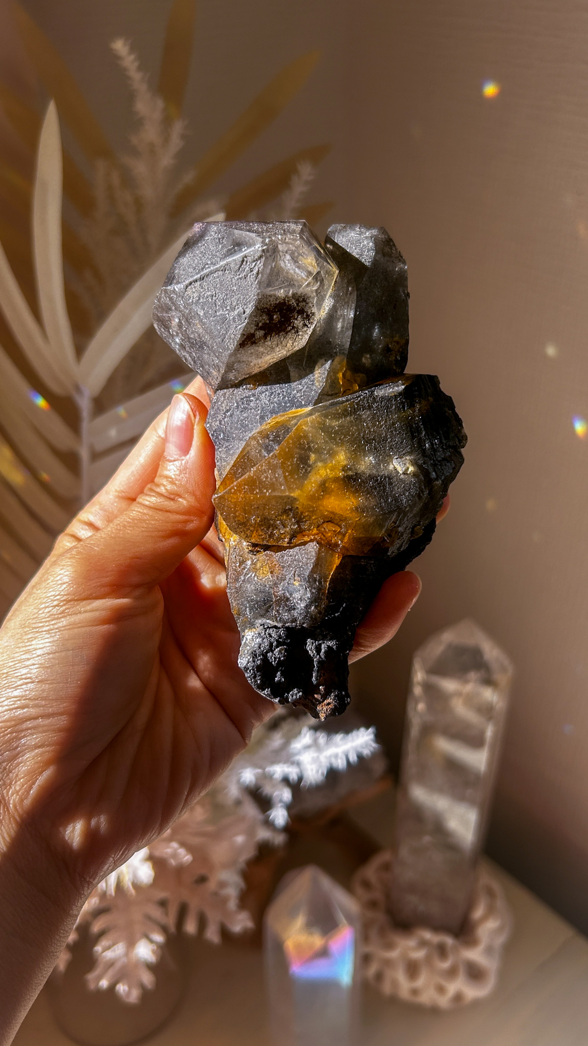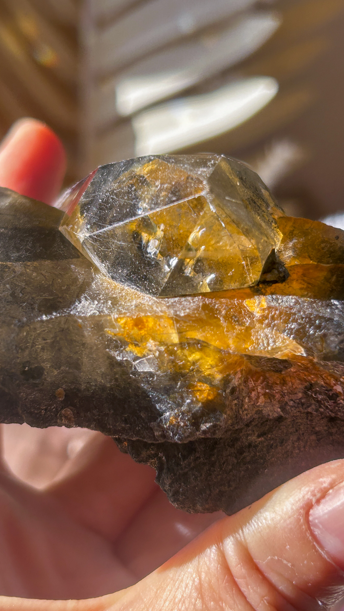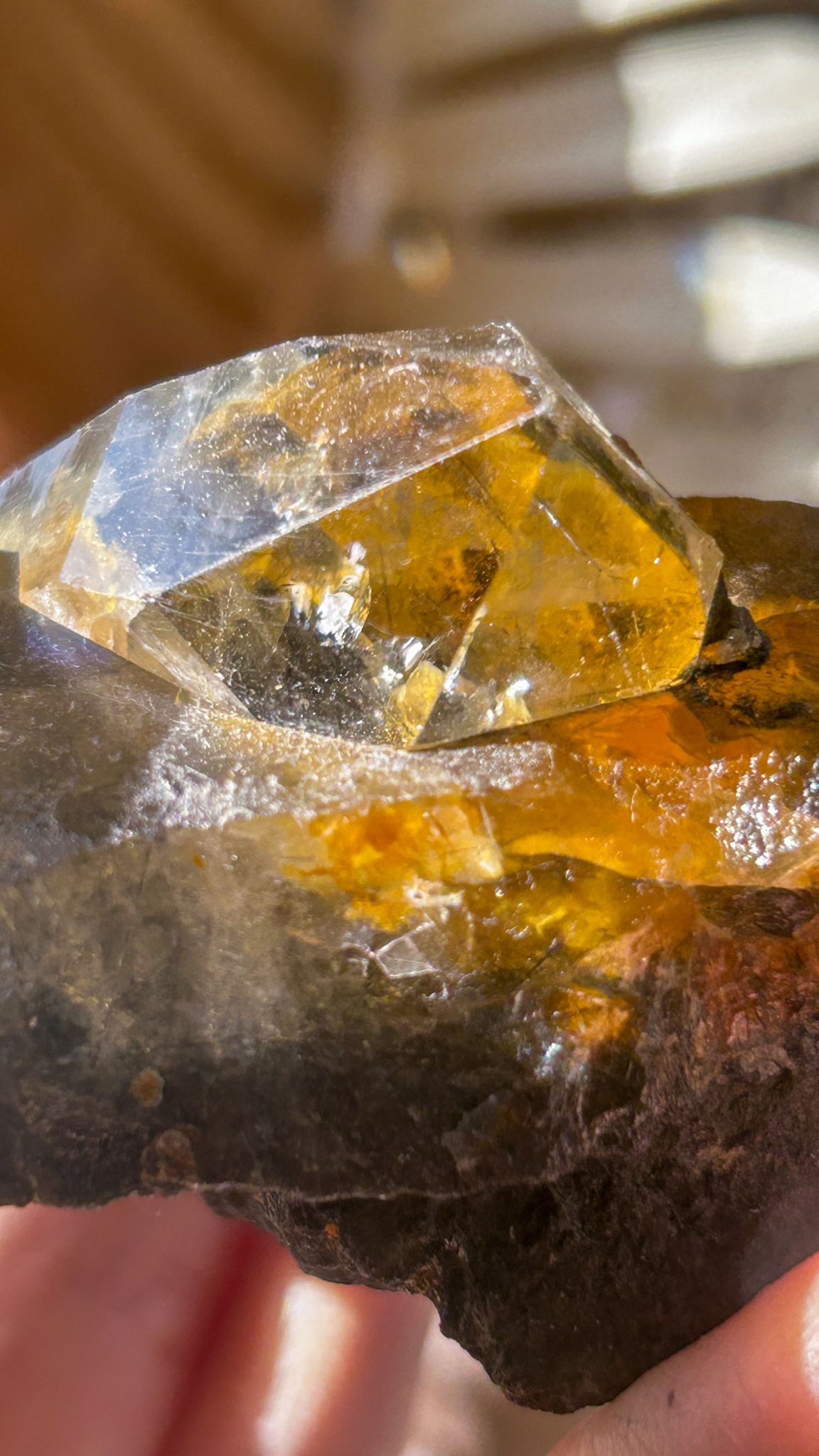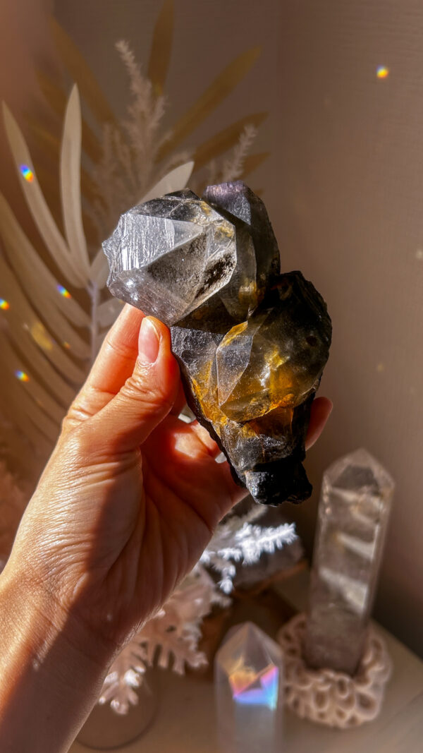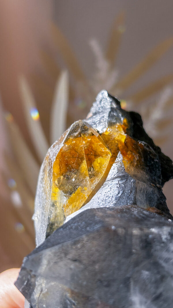 光を透かして中が見える面と、輝きで覆われ奥が見えない面。その対照が、このクリスタルの大きな魅力であり、まるで秘密を抱えているかのようなパーソナルなエネルギーを感じます。