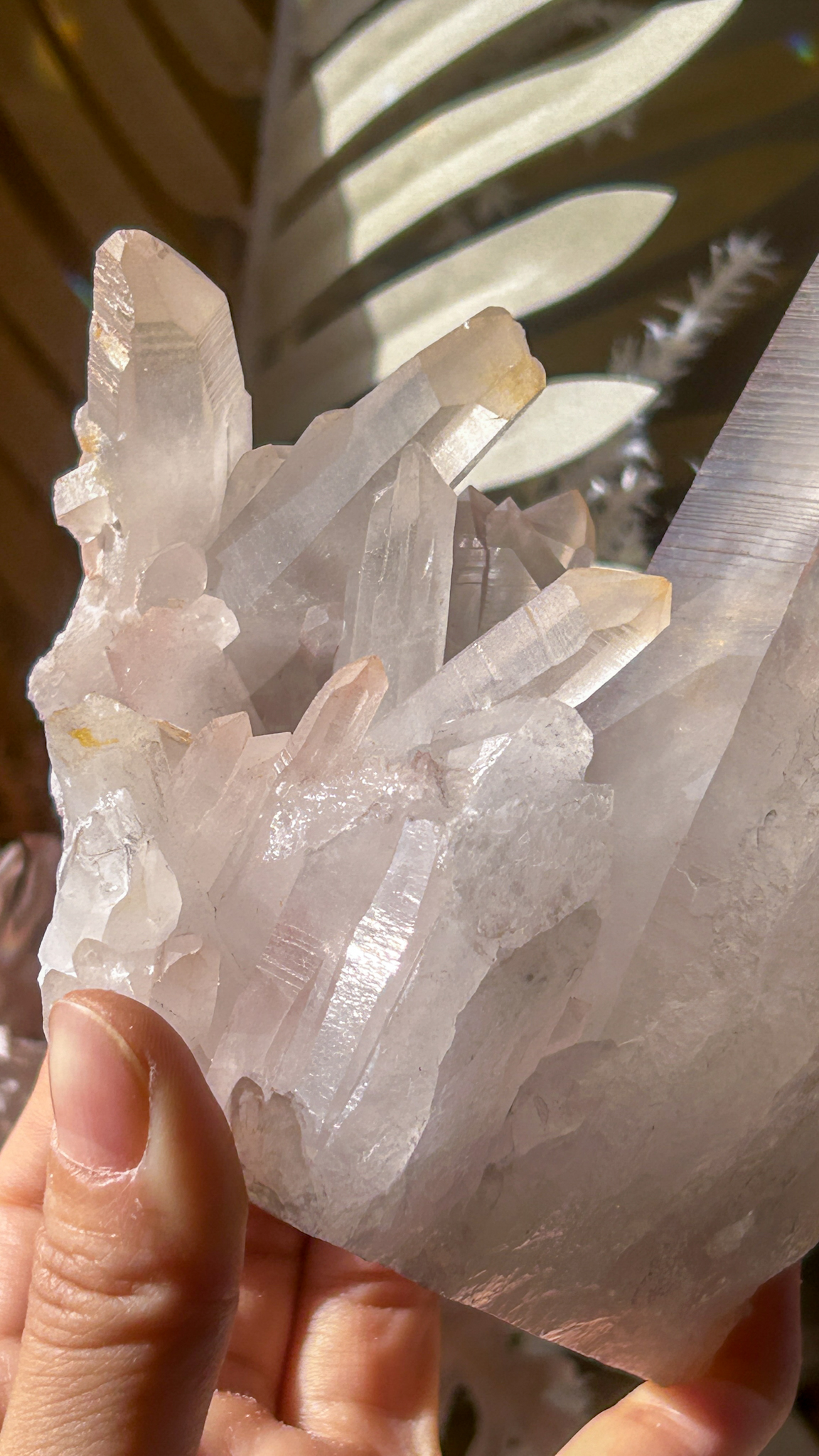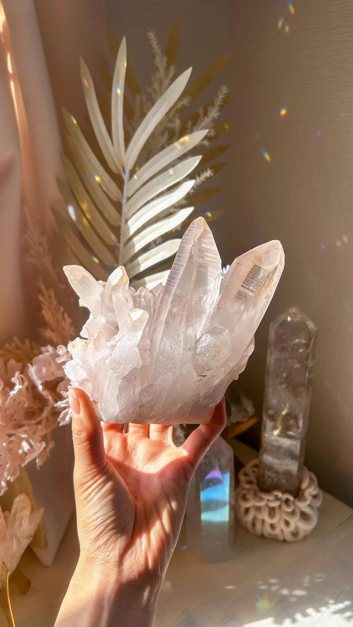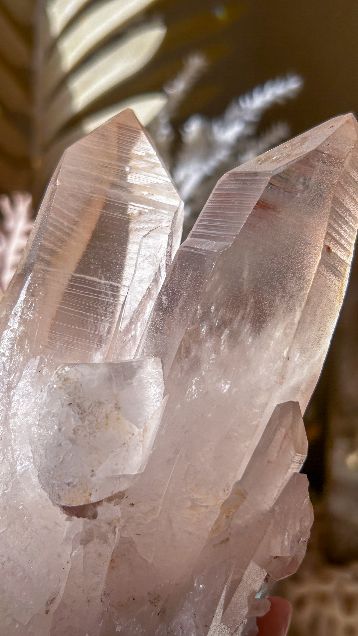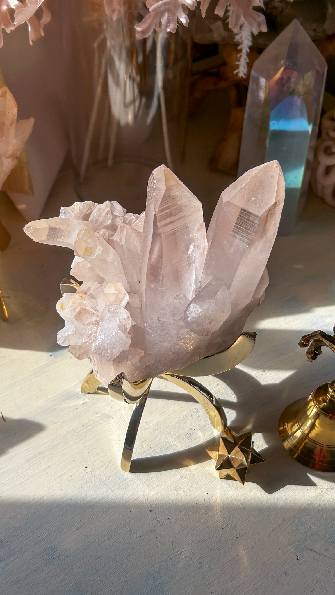 ポイントには、レムリアの叡智を宿すくっきりとしたリッジ(条線)が深く刻まれており、複数のポイントが力強く群生したクラスター形状は非常に珍しく、圧倒的な存在感を放ちます。カブラル鉱山は現在ほぼ閉山しているため、レアピースです。