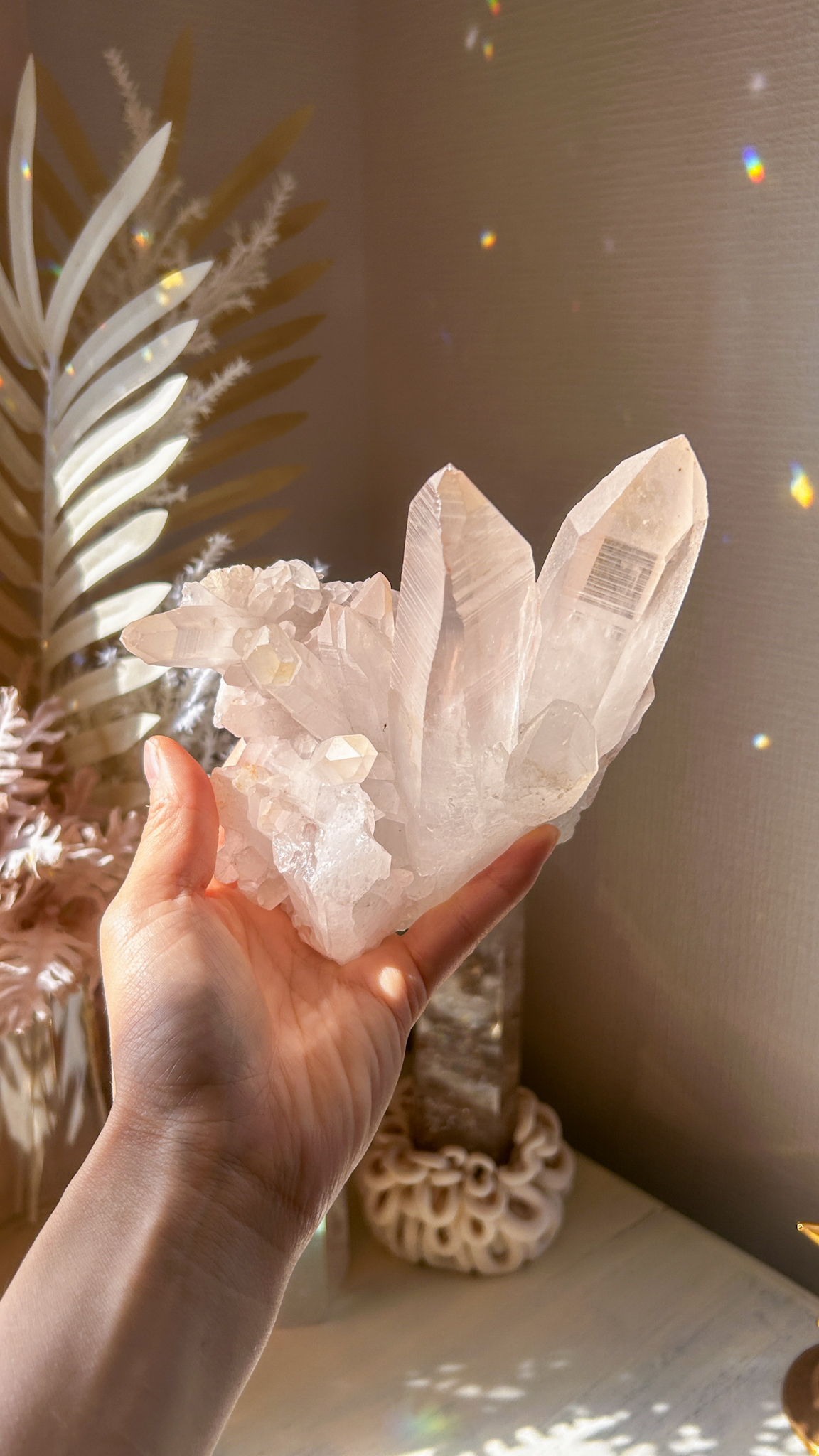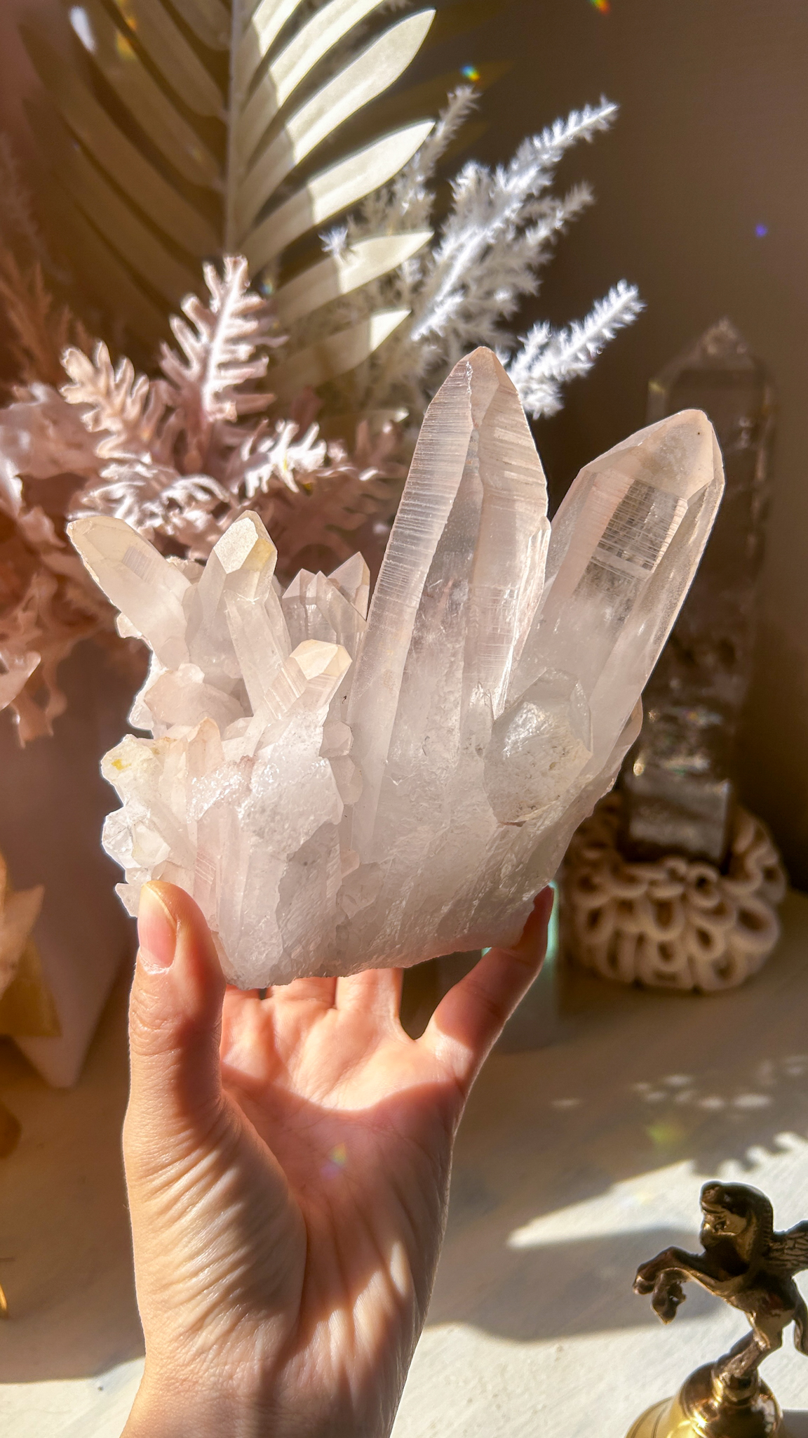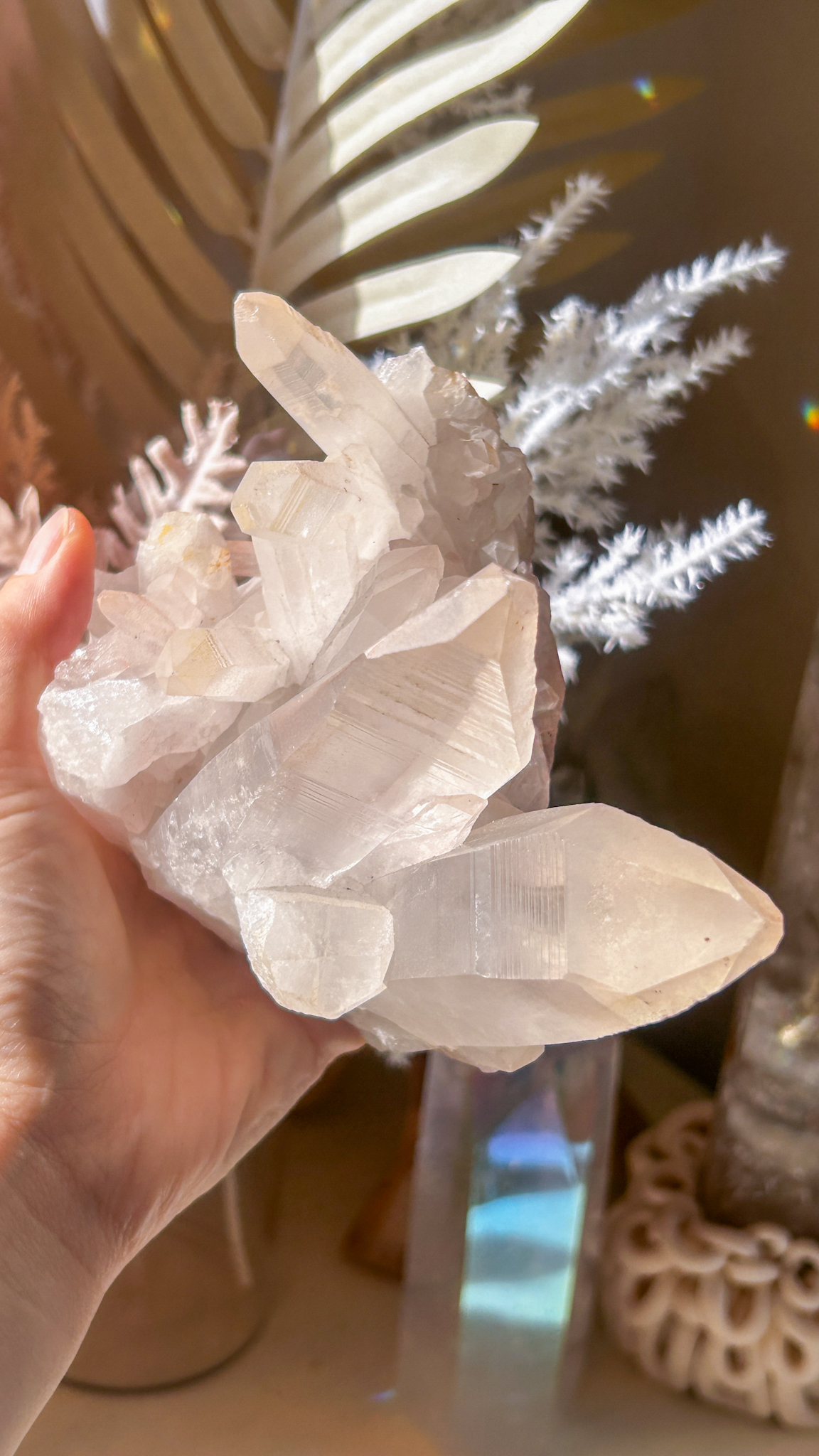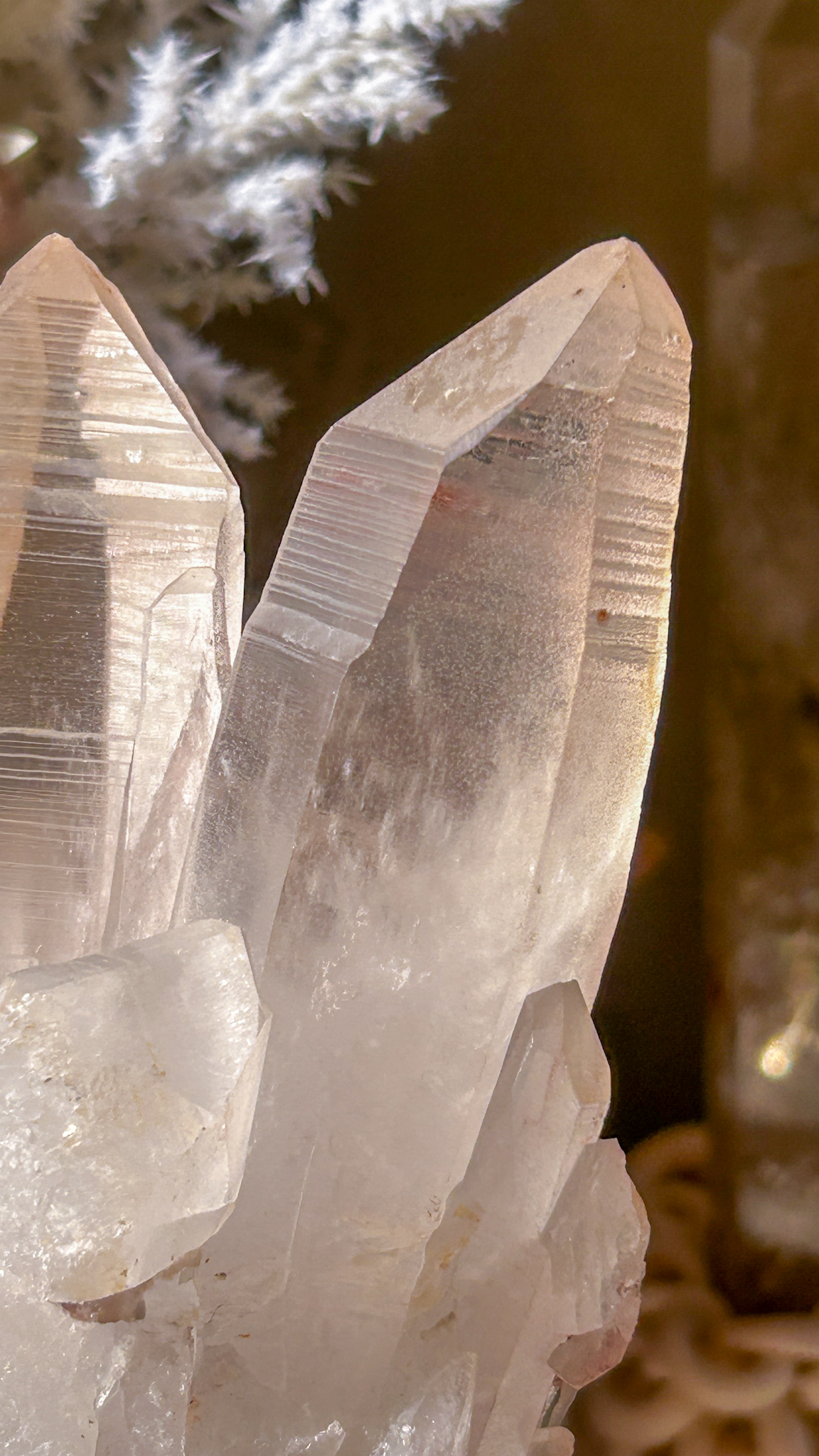 ポイントには、レムリアの叡智を宿すくっきりとしたリッジ(条線)が深く刻まれており、複数のポイントが力強く群生したクラスター形状は非常に珍しく、圧倒的な存在感を放ちます。カブラル鉱山は現在ほぼ閉山しているため、レアピースです。