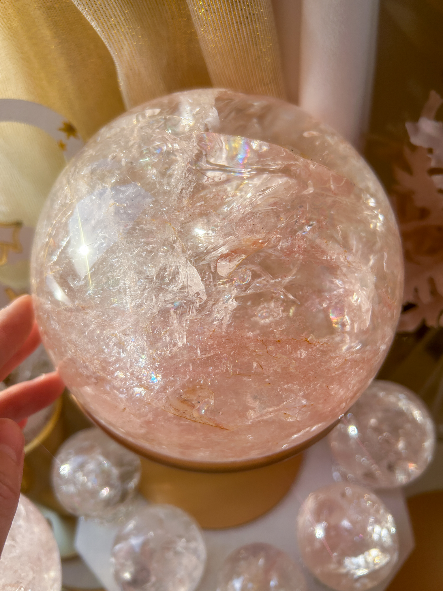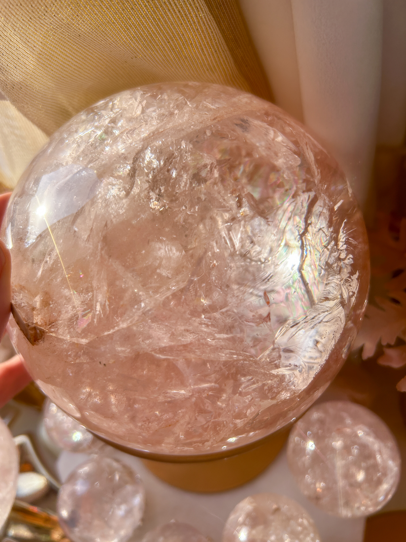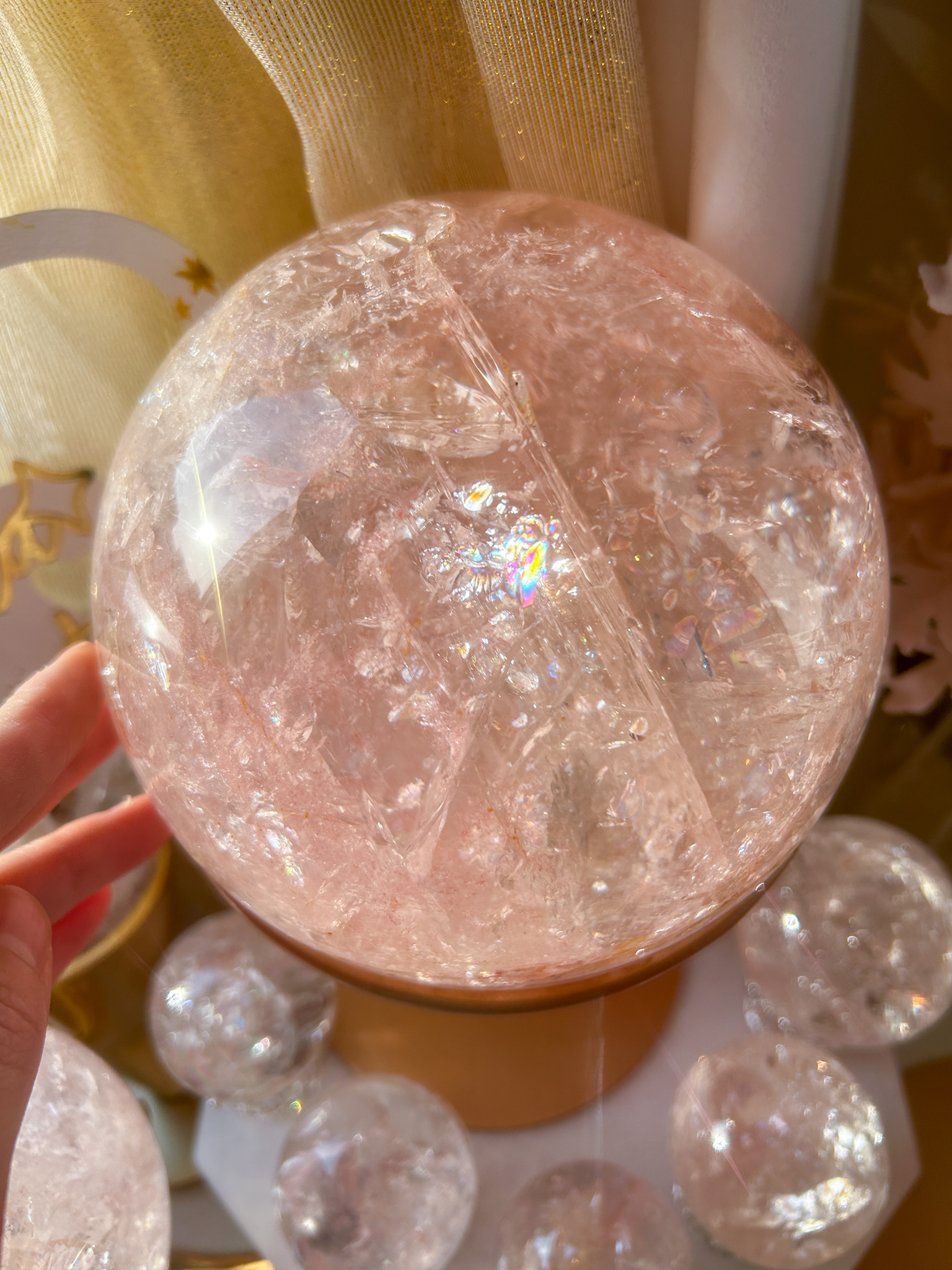 その彩りはヘマタイトがもたらした奇跡であり、こちらのスフィアは赤ブラウンになった部分が一部あり、ヘマタイトが共生して入り込んでいるのがわかります。一部は素晴らしい透明感もあり、虹も全体に見られ、球体の中でピンクの光が舞っているようにも見えます。 光を受けて浮かび上がるレインボーは「愛の開花」の瞬間を映し出しています。