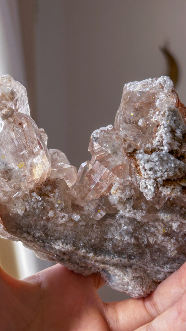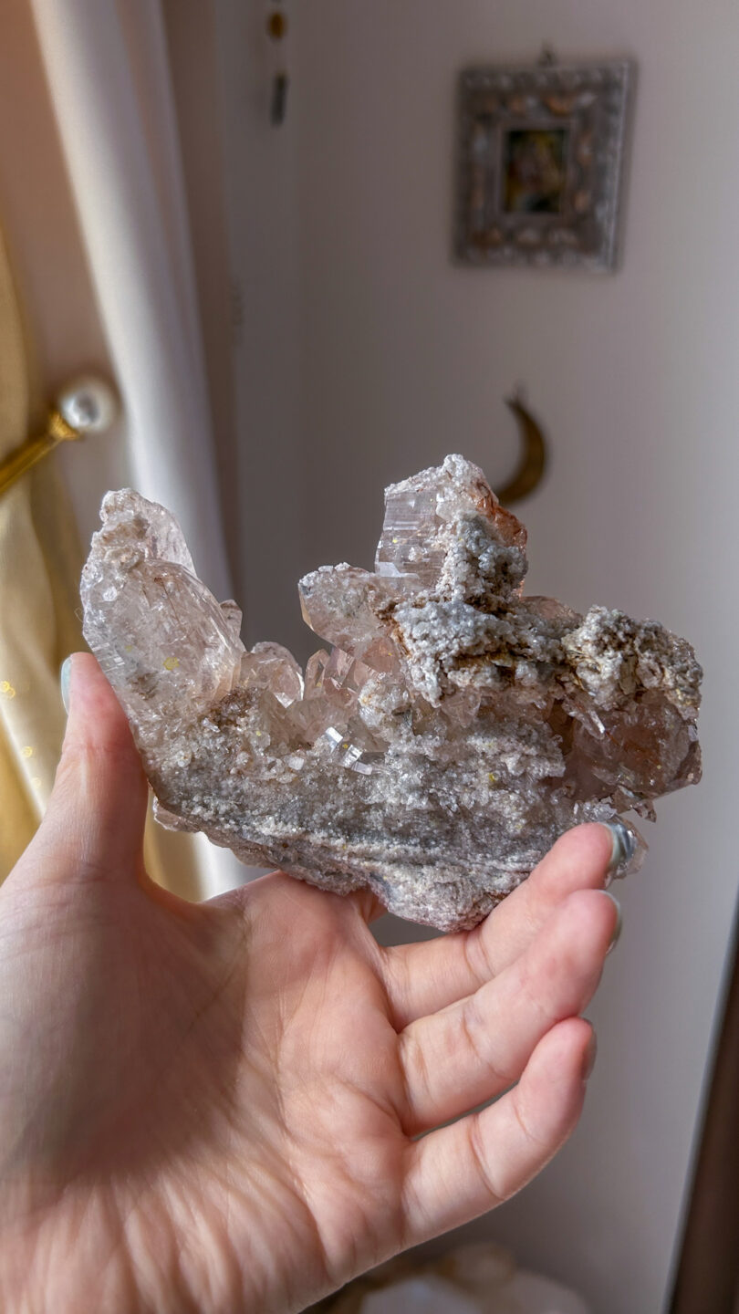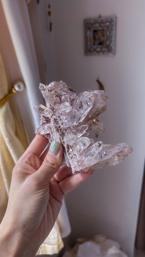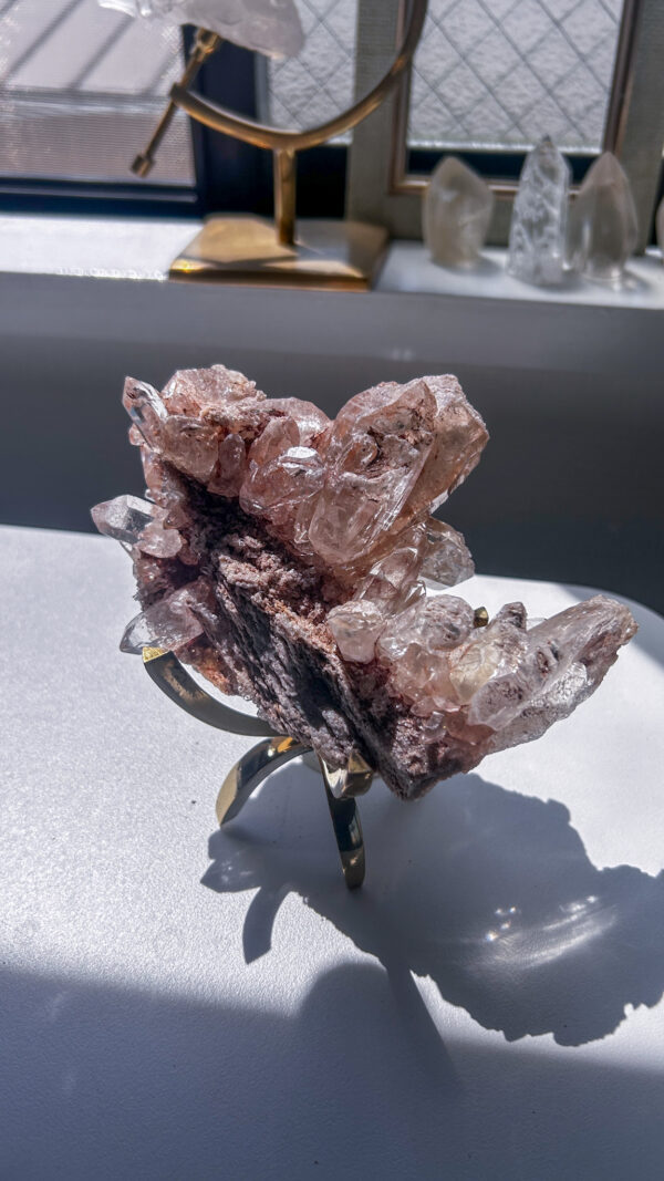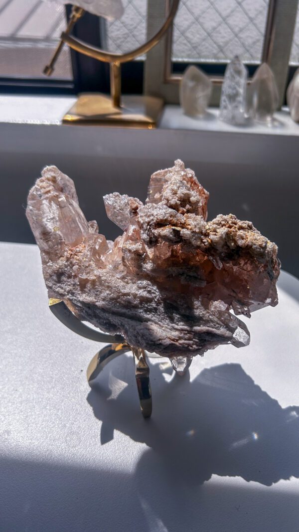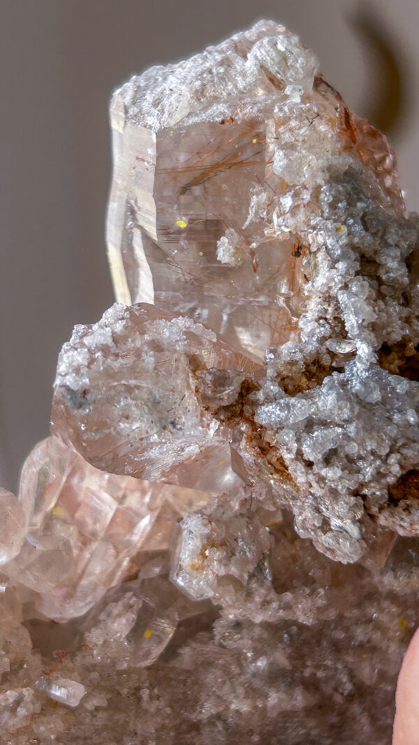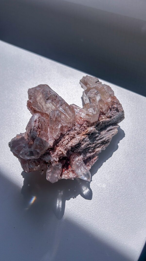特徴:ピンクがかった透明水晶に、炎のように伸びる赤いルチル