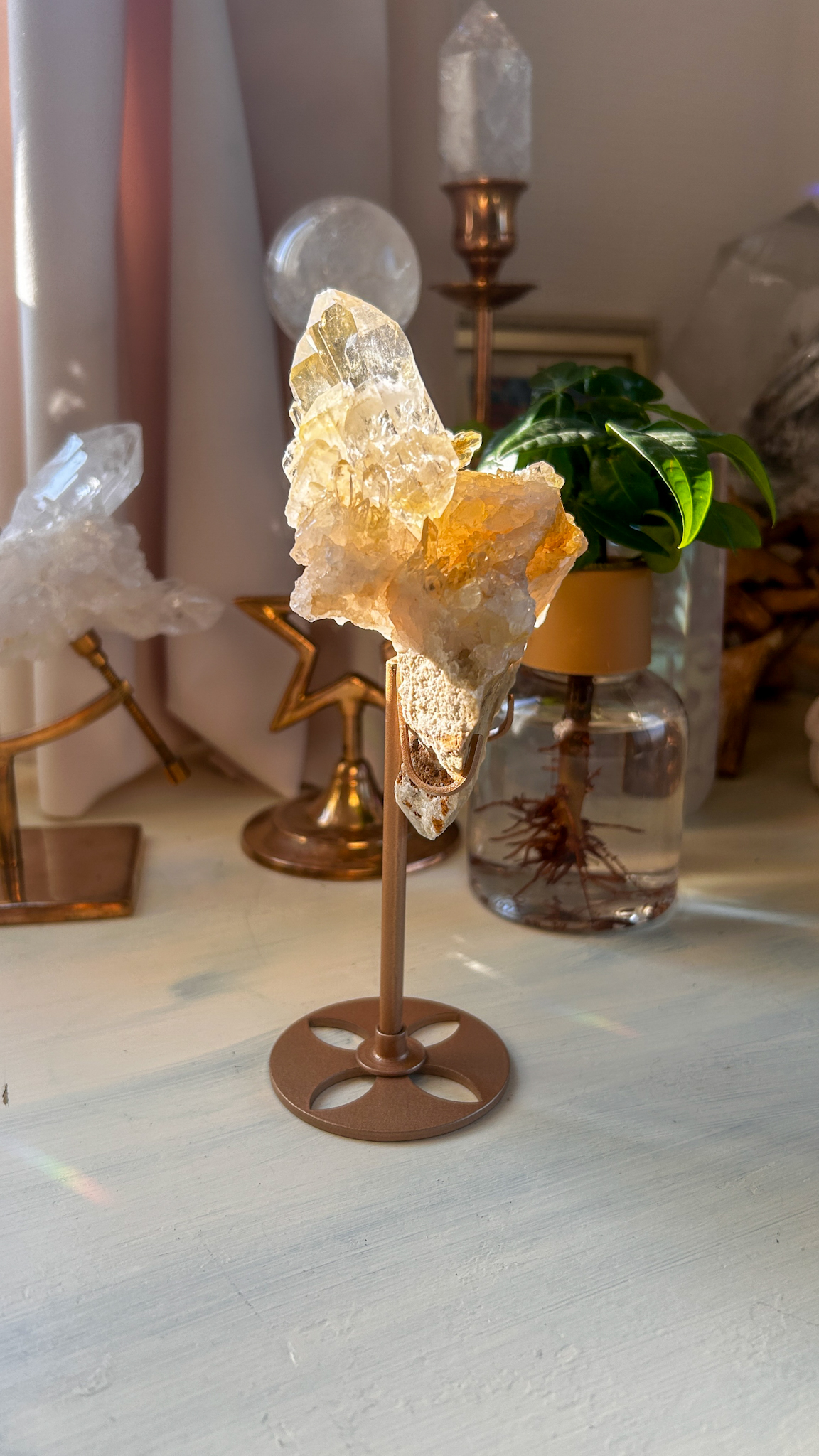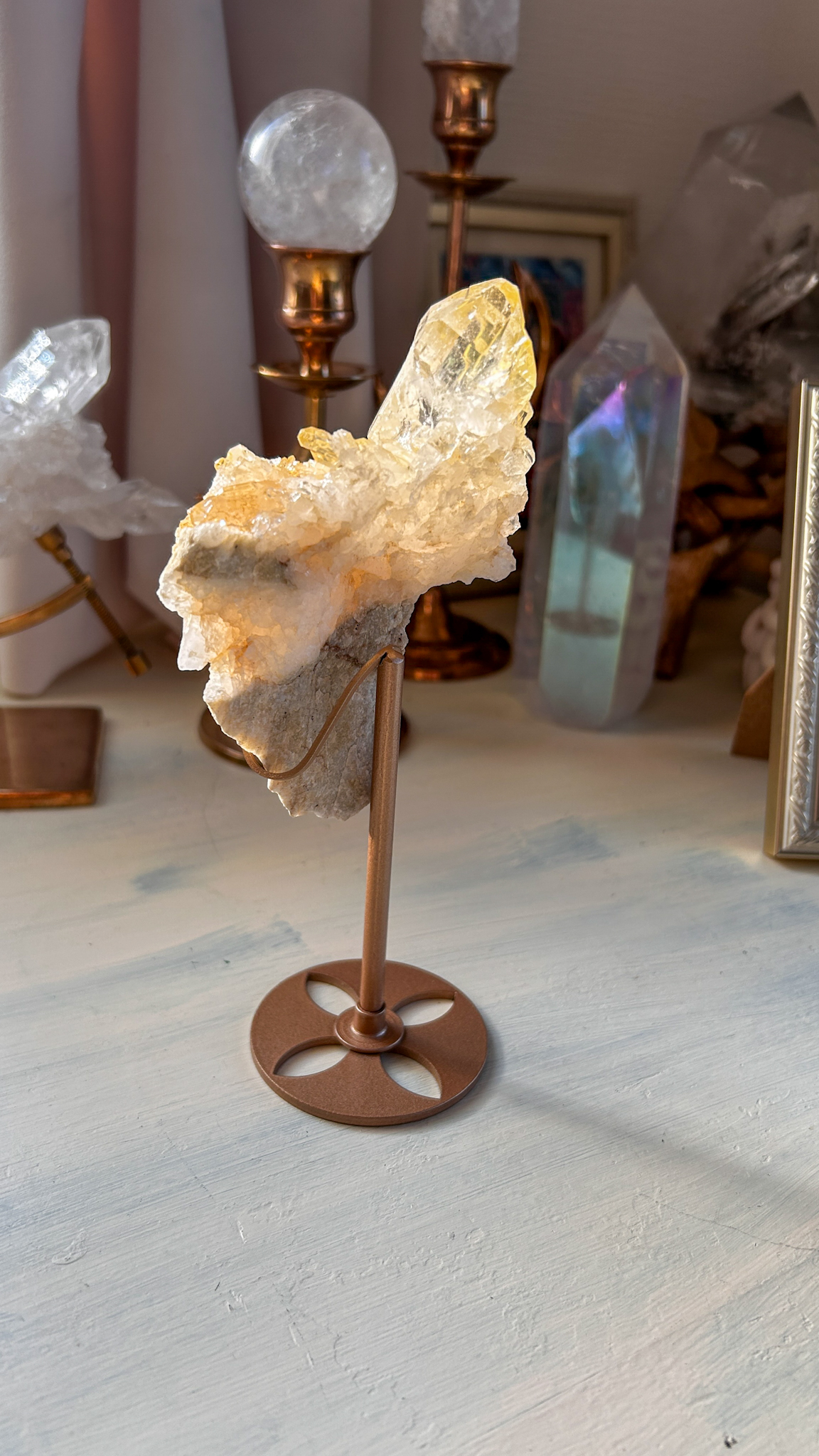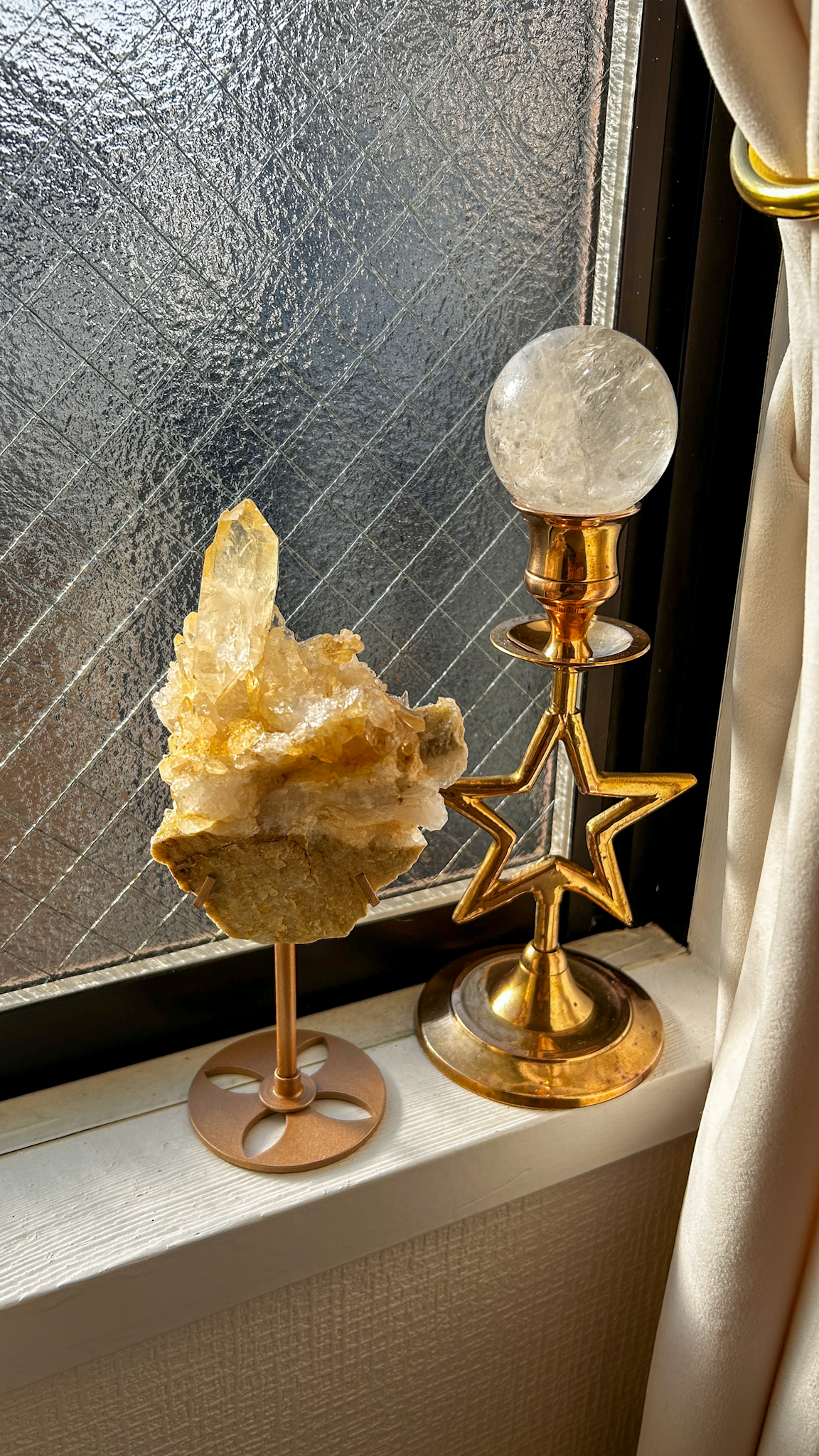 少し不思議な形をしており、スタンドに立ててもいいですし、母岩部分にジュエリーなどをおいて浄化としてもも良い感じです。 自己ヒーリングや瞑想を深めたい方、日常にあたたかさと希望を取り戻したい方、太陽のように周囲に光を与える存在でありたい方などに特におすすめ。