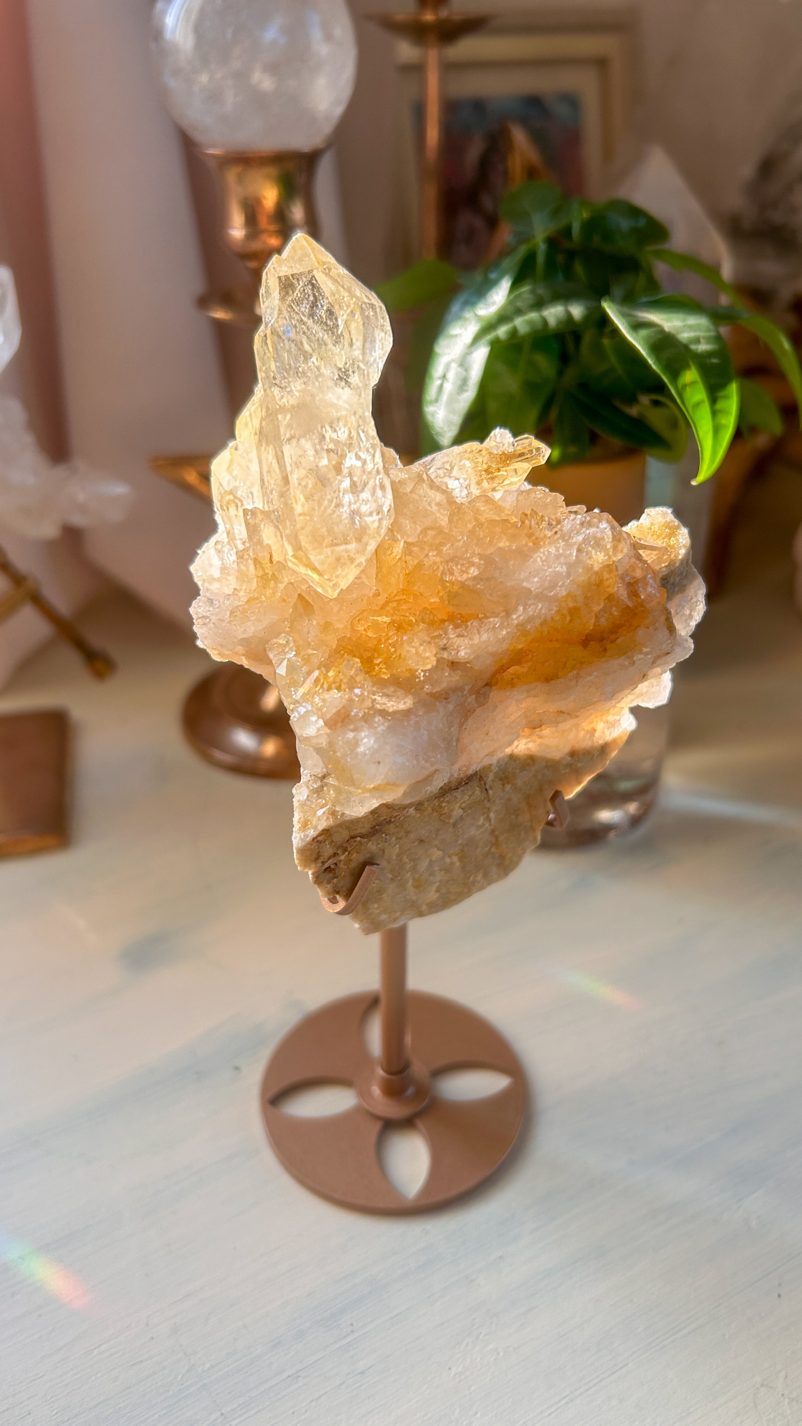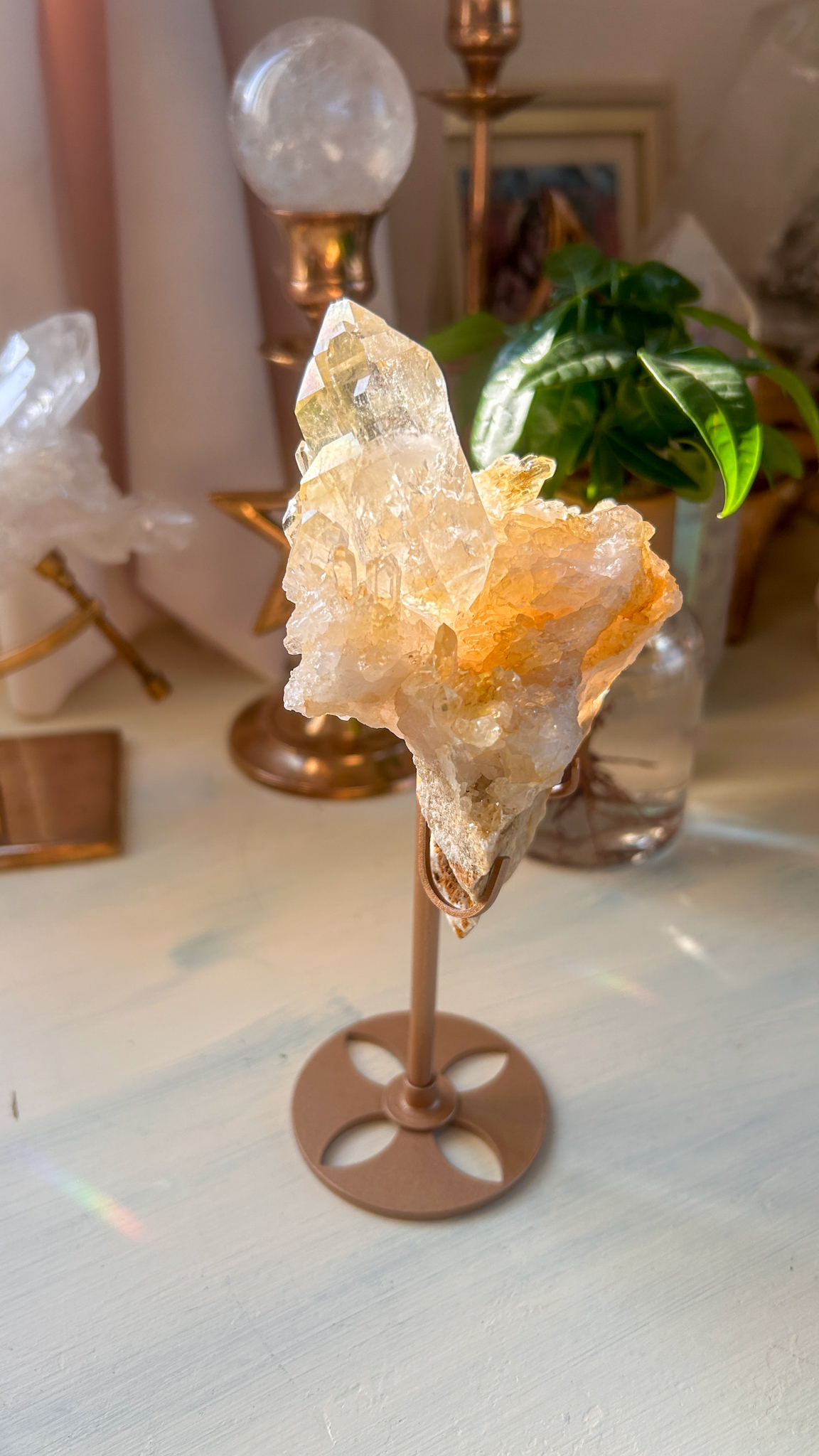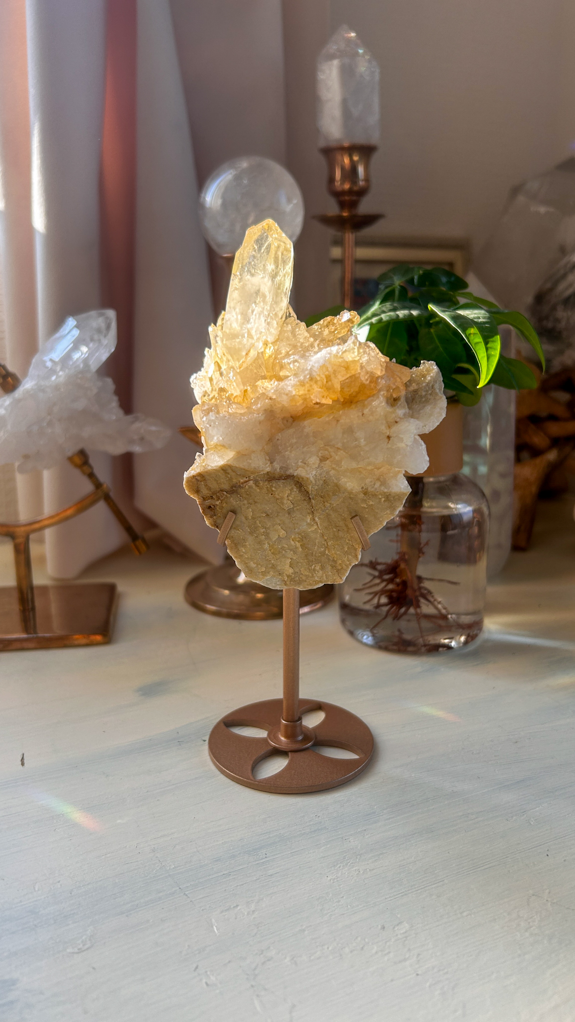 少し不思議な形をしており、スタンドに立ててもいいですし、母岩部分にジュエリーなどをおいて浄化としてもも良い感じです。 自己ヒーリングや瞑想を深めたい方、日常にあたたかさと希望を取り戻したい方、太陽のように周囲に光を与える存在でありたい方などに特におすすめ。